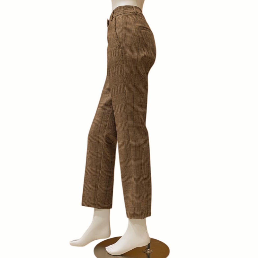 ブラウンチェックがオシャレな印象を与えるこちらのパンツは、カジュアルからビジネスシーンまで幅広く活躍するアイテムです。シルエットを美しく見せる設計で、さまざまなトップスと組み合わせやすいのも魅力です。