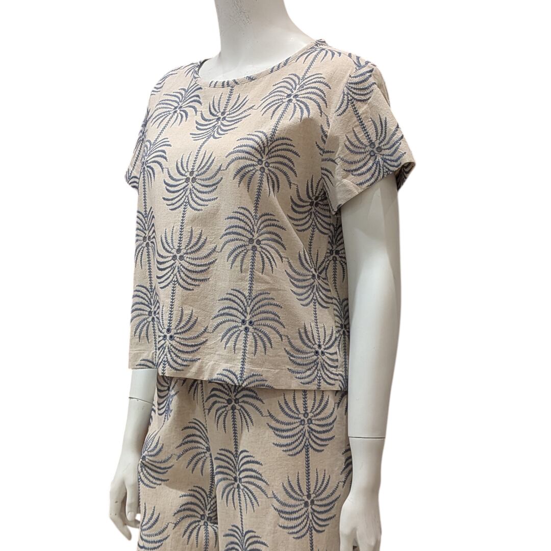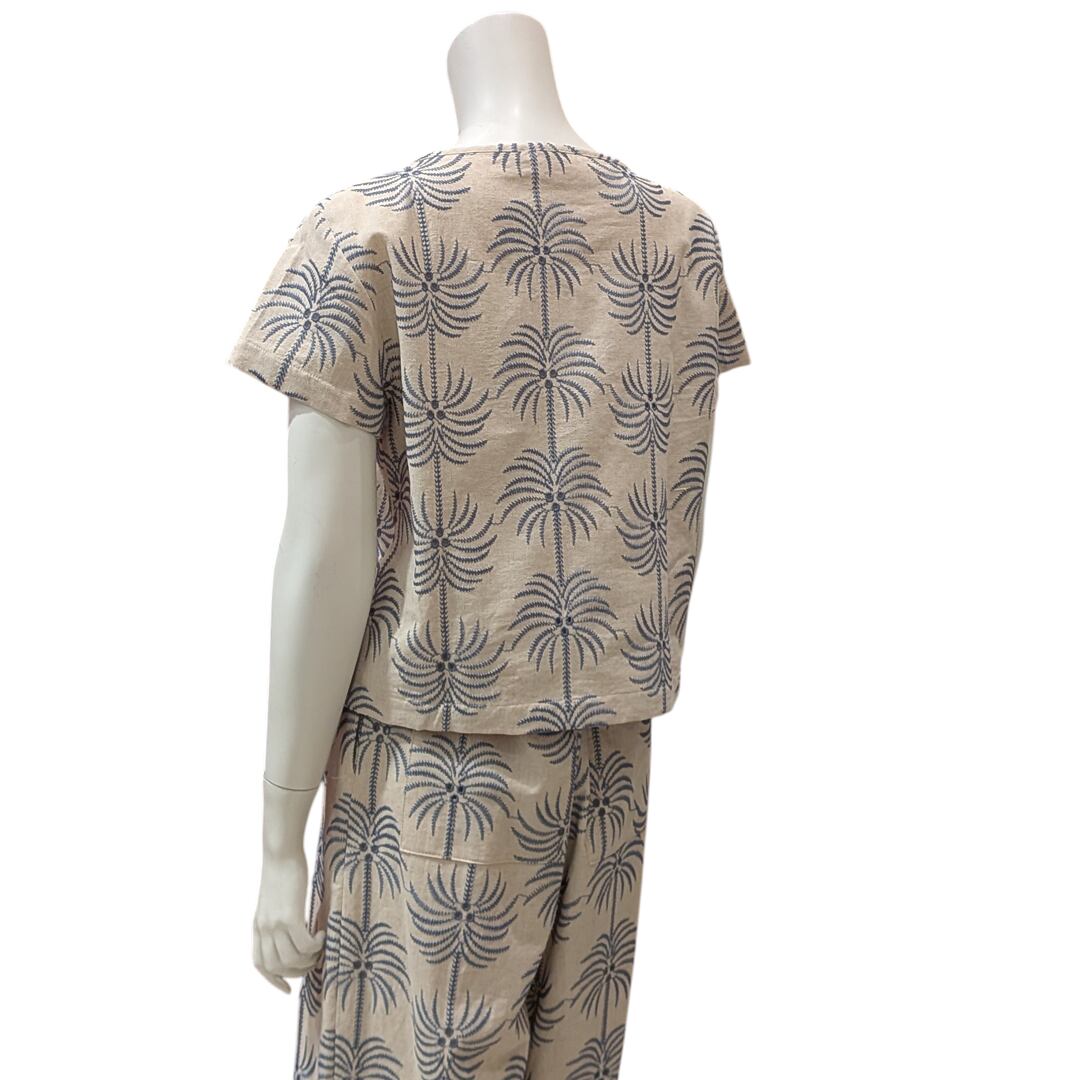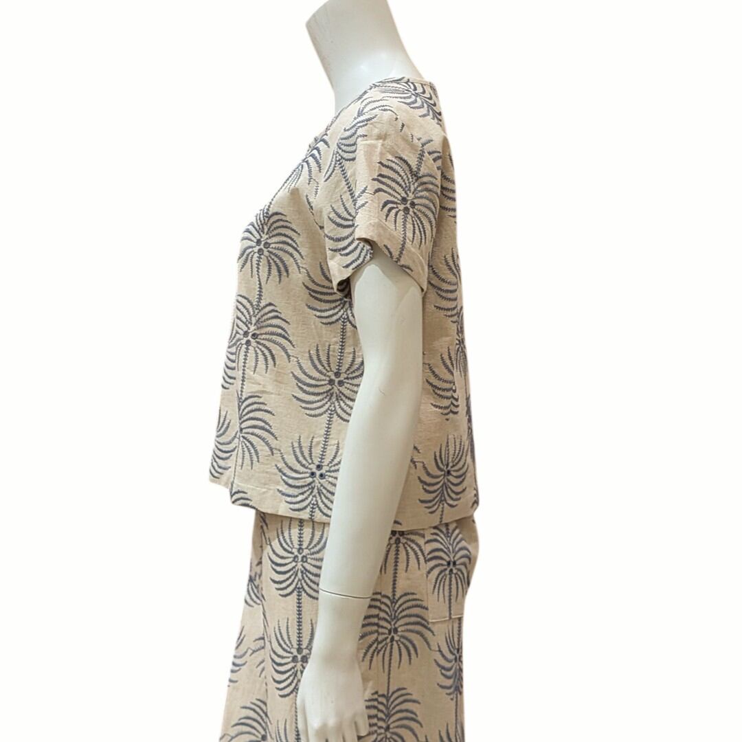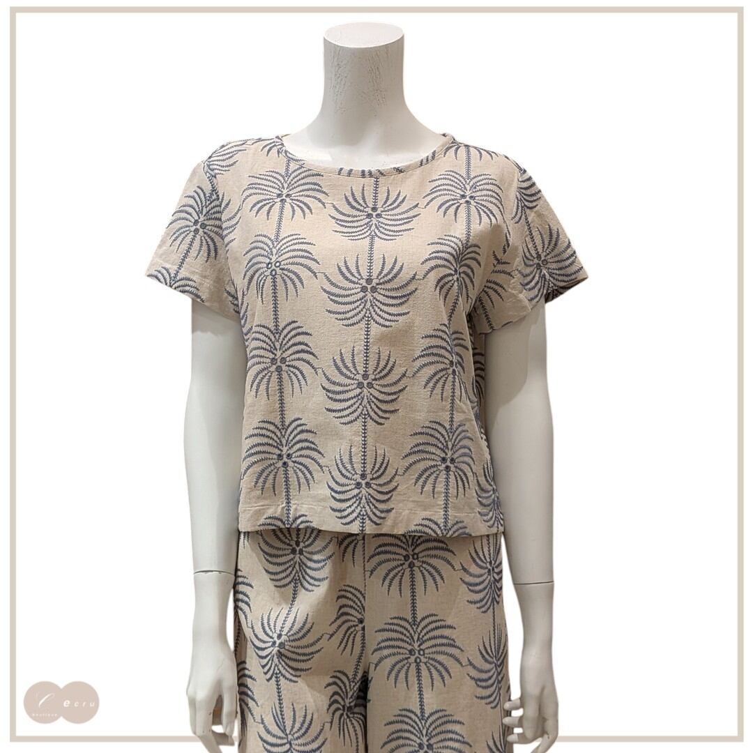 爽やかなヤシの刺繍が施されたブラウスは、夏のコーディネートにぴったり!軽やかな着心地で、涼しげなデザインが魅力です。シンプルなボトムスと合わせることで、カジュアルなスタイルが完成します。特別なお出かけやデイリーユースにもおすすめ。さらに、同生地のパンツと組み合わせることで、スタイリッシュなセットアップとしても楽しめます。