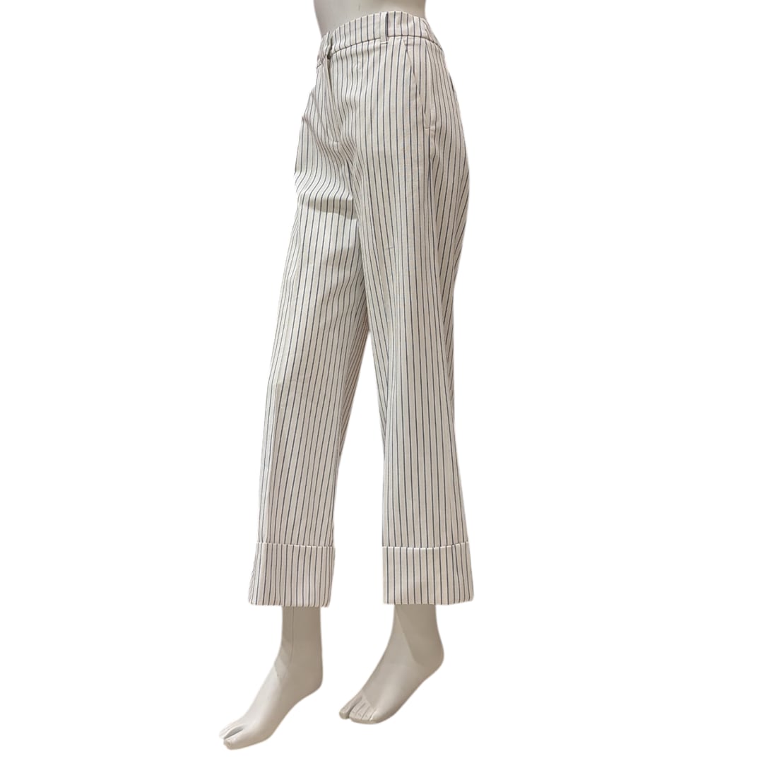 ストライプデザインが目を引くダブルパンツ。シルエットが美しく、体型をカバーしつつスタイリッシュに見せてくれます。軽やかな素材感が涼しさを感じさせ、リラックスした着心地を実現。カジュアルなシーンから、カジュアルフォーマルな場面まで幅広く活用できる万能アイテムです。スタイリング次第でさまざまな表情を楽しめる一着です。