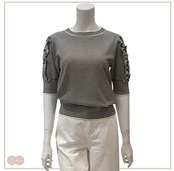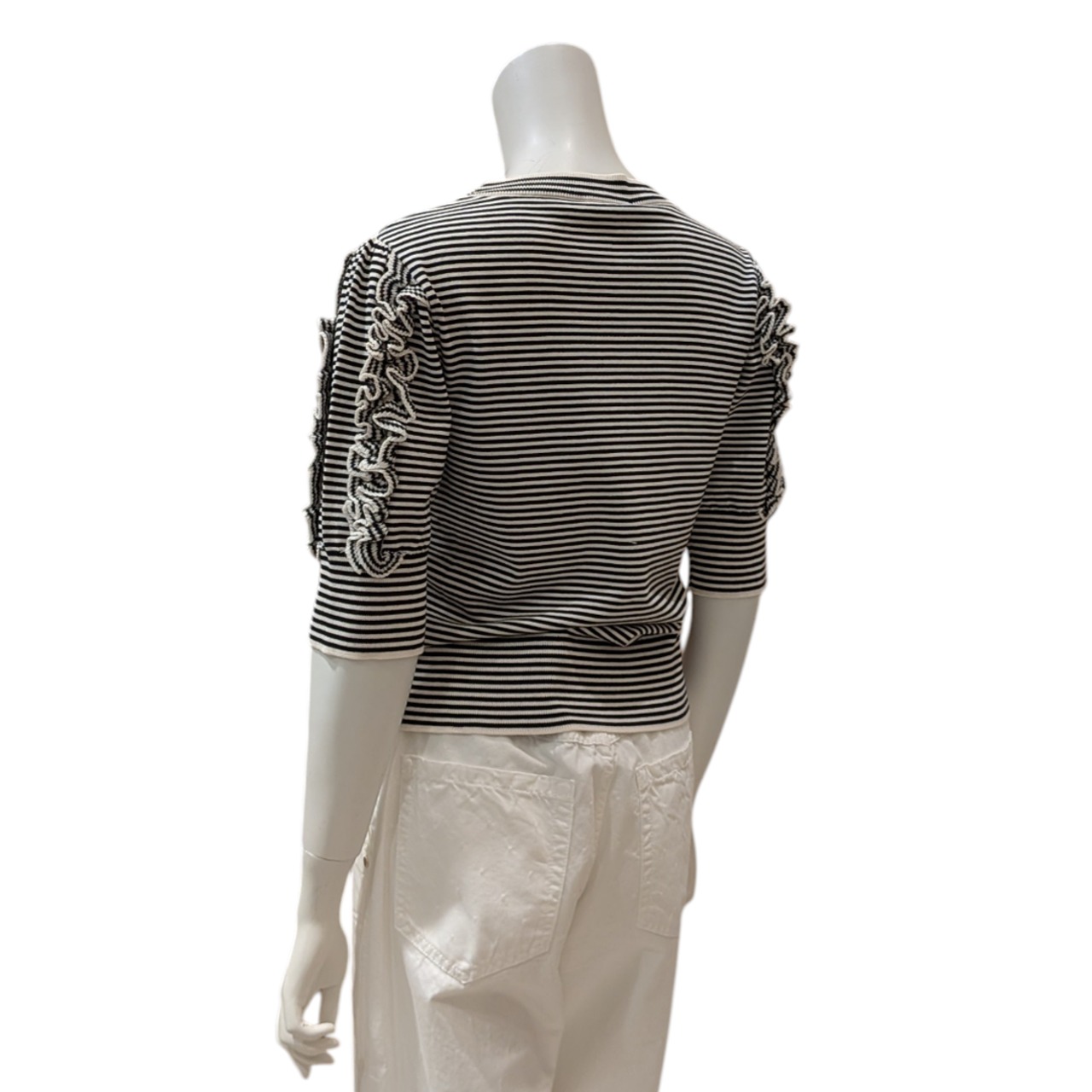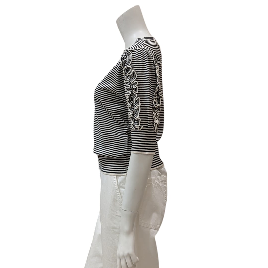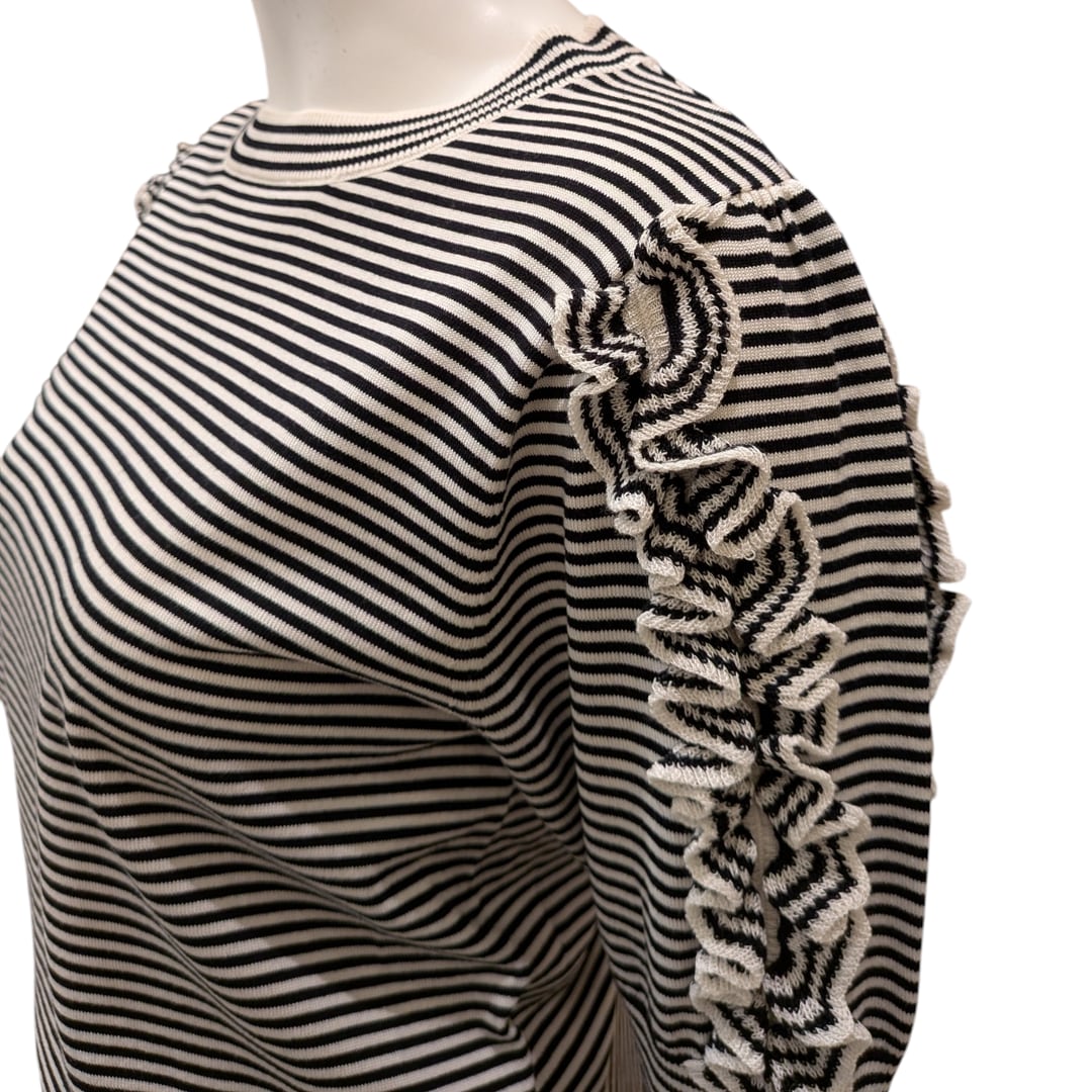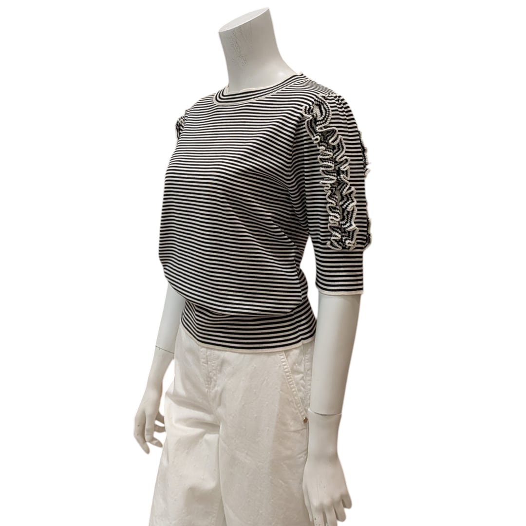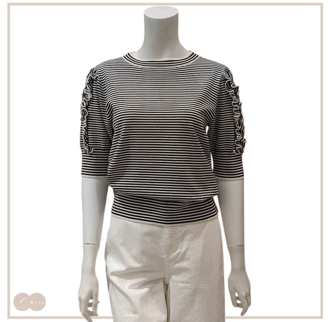 シンプルでありながら、スリーブのフリル使い、ボーダーデザインがアクセントになっています。品のある女性らしさが印象的です。カジュアルからキレイめスタイルまで幅広く合わせやすいアイテムです。