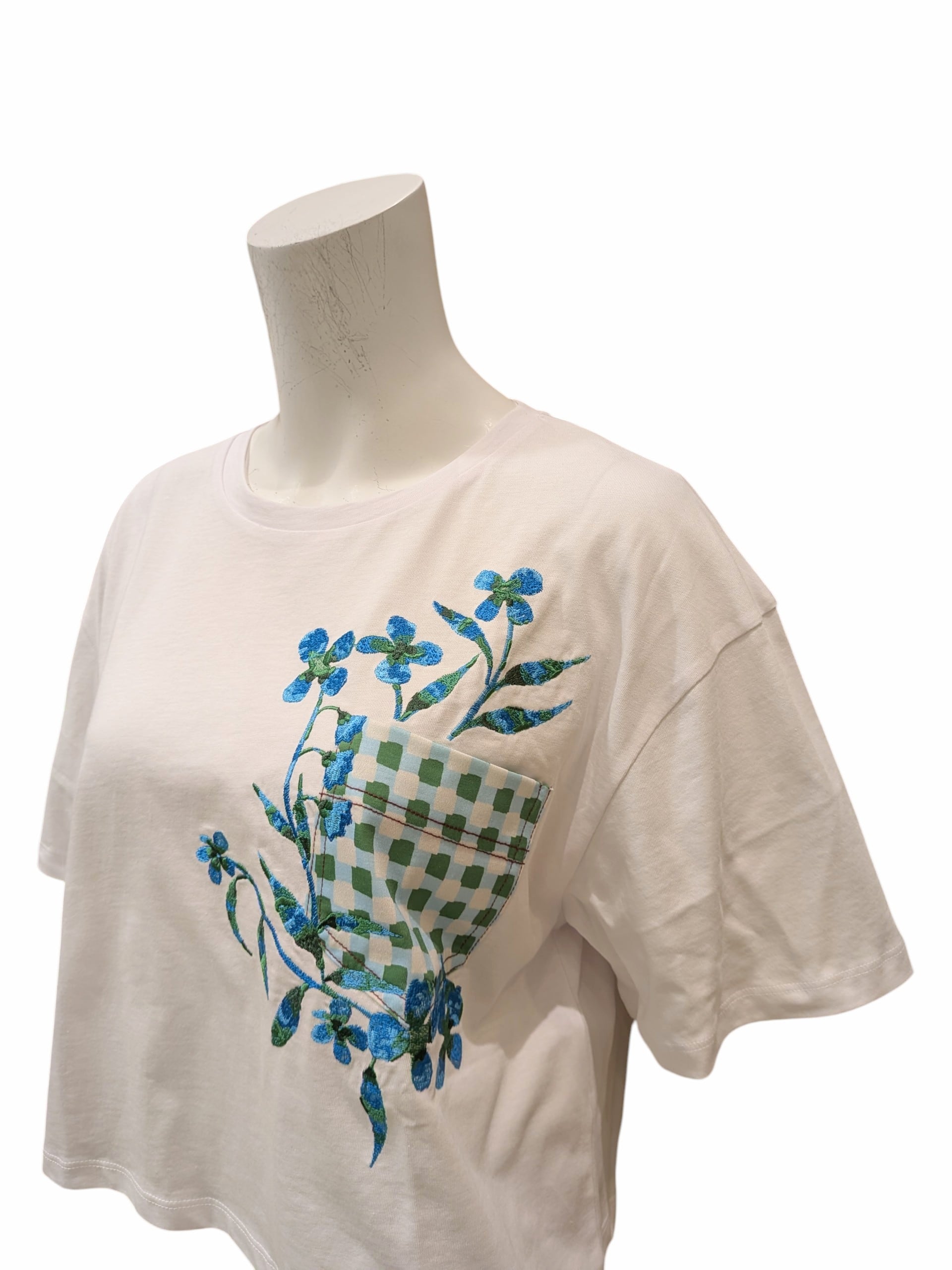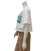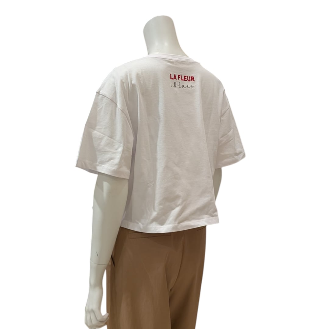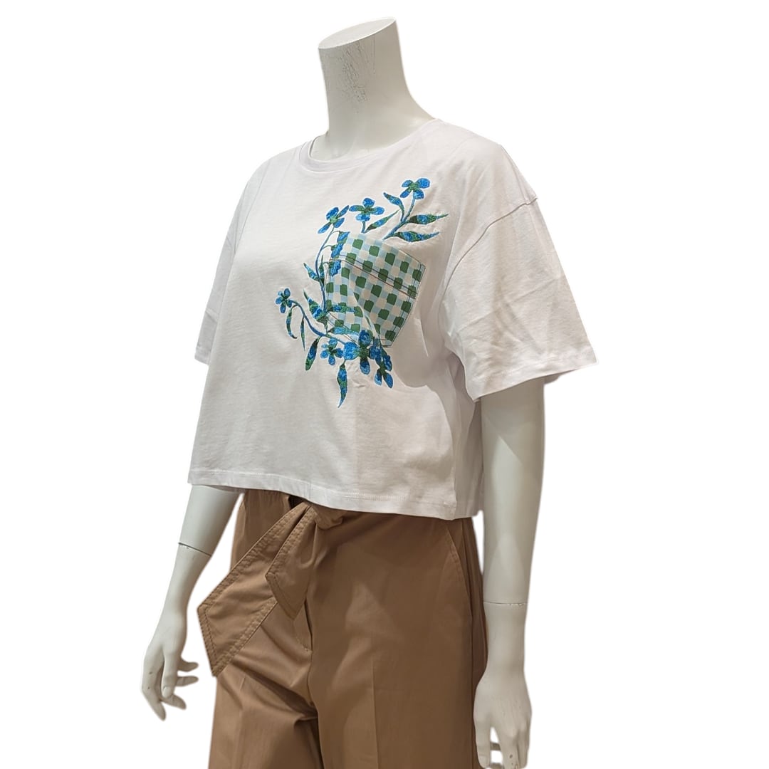 爽やかなカラーの刺繍が施されたデザインで、シンプルながらもアクセントになっています。デニムやスカートと合わせて、カジュアルにもキレイめにもスタイリング可能です。トレンド感のあるショート丈は着るだけでおしゃれに着こなせます。